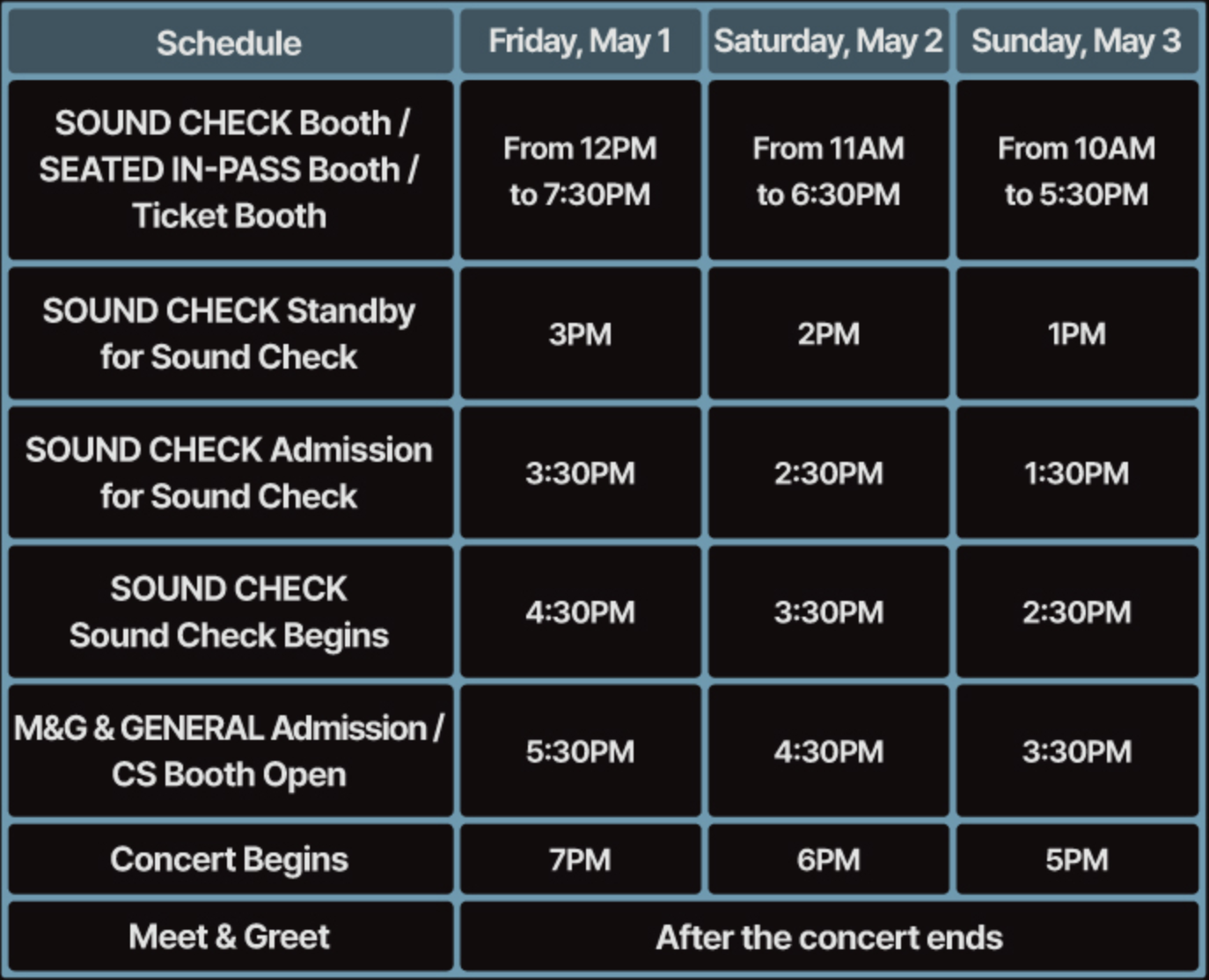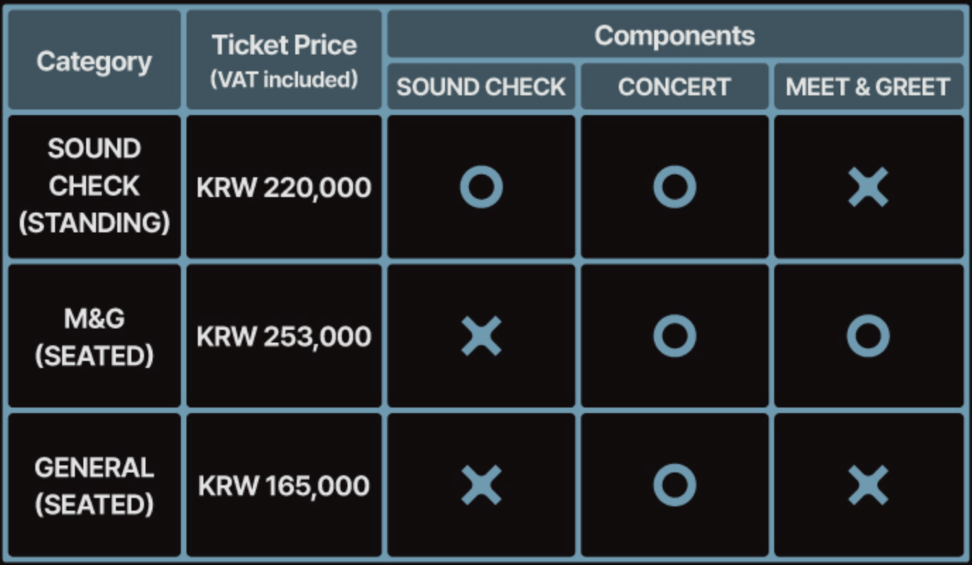 🎶 SOUND CHECK The Sound Check event will take place around 2 hours and 30 minutes before the concert. Once the Sound Check event concludes, re-entry is not permitted if you exit the concert venue. However, you will be allowed to use the lobby, including the restrooms, inside the venue. 🤝 M&G (Meet & Greet) The Meet & Greet (M&G) event is an opportunity for fans to greet the artist after the main performance. It will run for around 10 minutes and will begin after the main concert has ended and the general audience has cleared the venue (around 40 minutes).