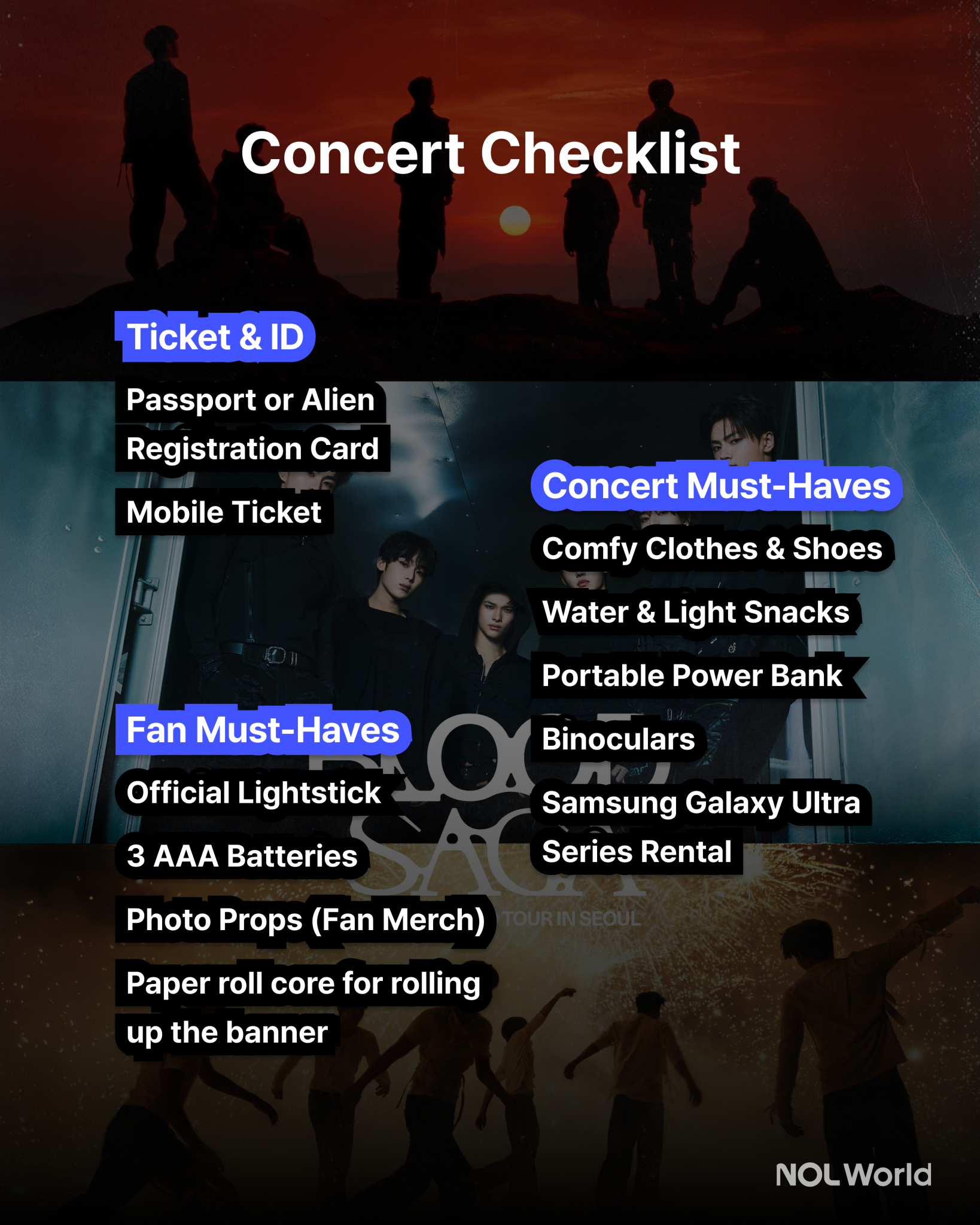 Don’t forget to bring your ID, your official light stick, and extra batteries. For memorable photos, bring some fan merch like photocards or plushies. If your seat is farther from the stage, a pair of binoculars will come in handy, too. With this checklist, you’ll be all set for the concert! ✨