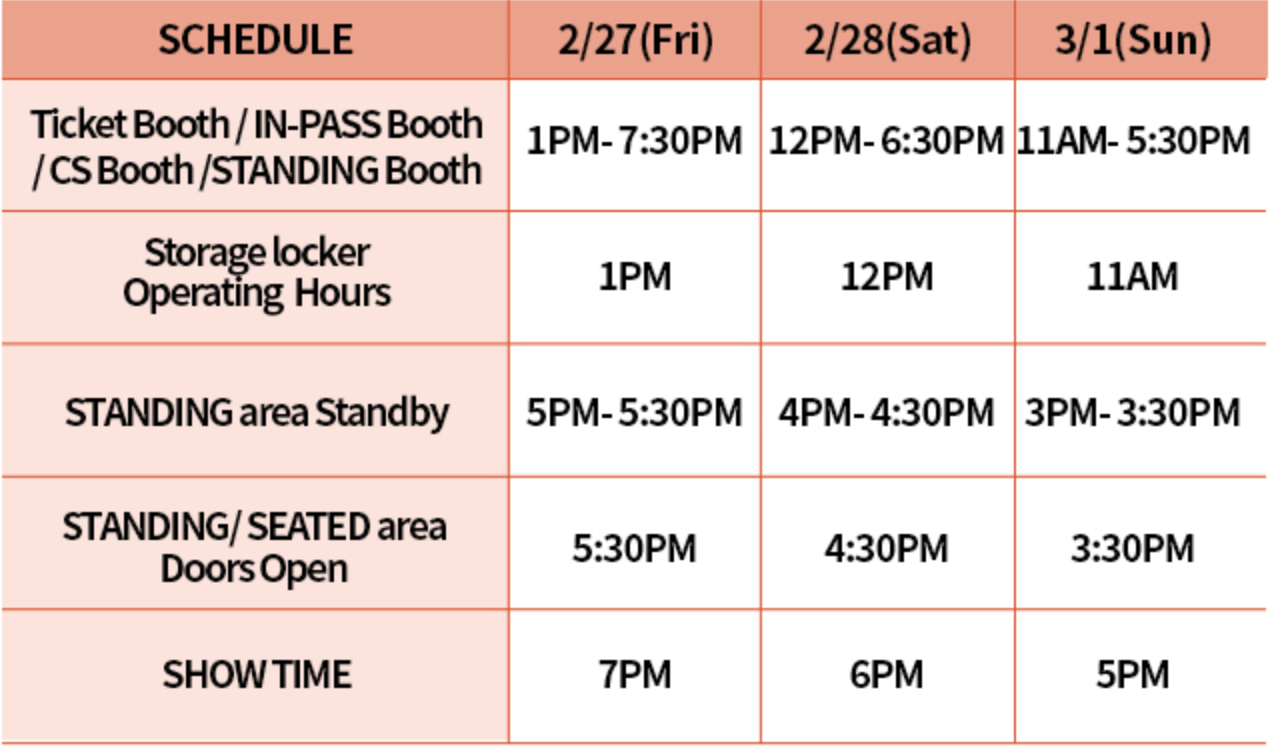 Entry times differ by ticket type and seating section. Please be sure to check the entry time for your reserved seat. Operating hours are subject to change based on the venue's on-site situation on the day of the event.