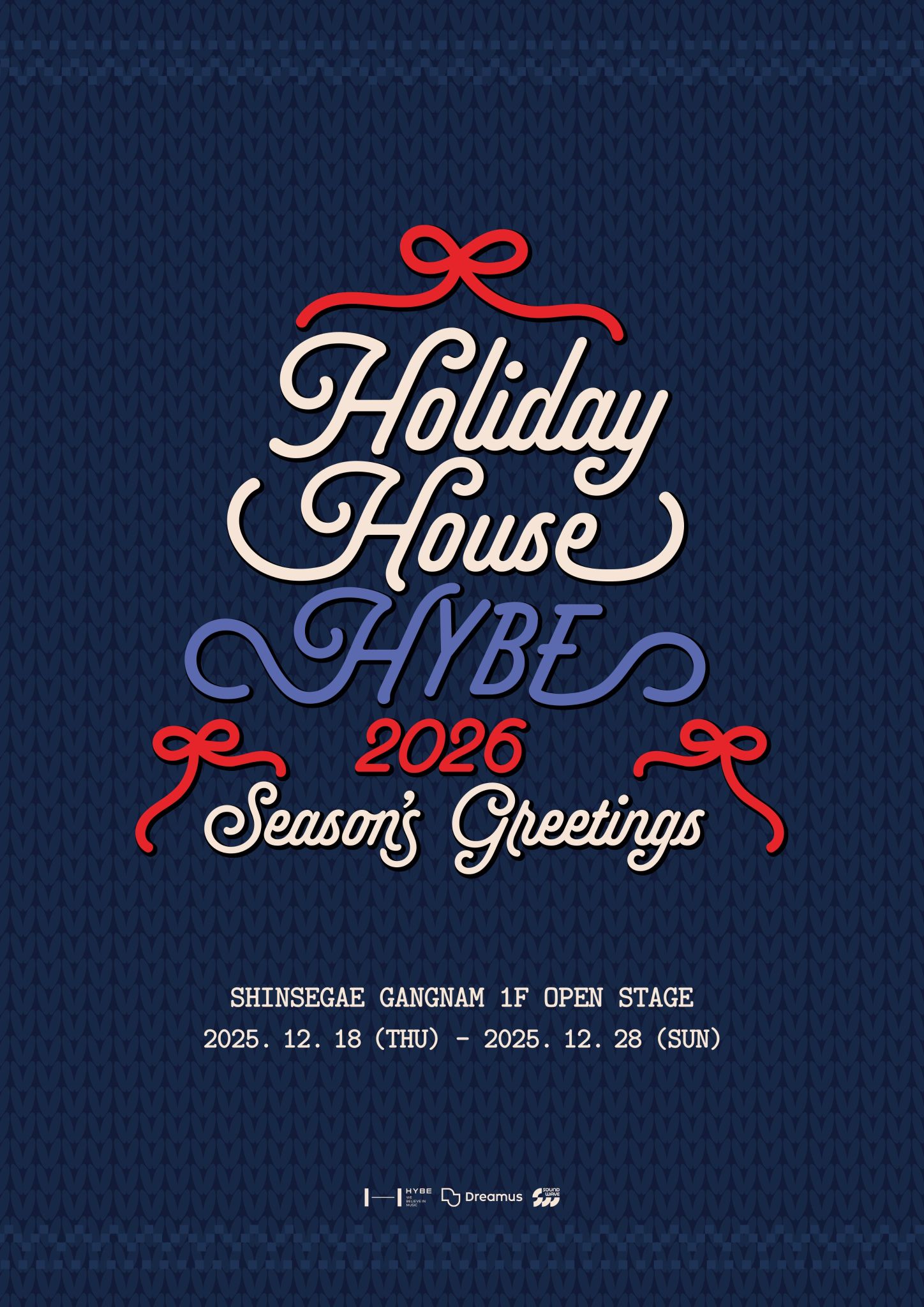 • How to ring in the New Year with HYBE artists? The pop-up store <HOLIDAY HOUSE>, where HYBE artists' 2026 Season's Greetings will gather in one place, is coming. A total of 9 teams' Season's Greetings will be revealed: SEVENTEEN, TOMORROW X TOGETHER, ENHYPEN, LE SSERAFIM, &TEAM, BOYNEXTDOOR, TWS, CAT'S EYE, and KORTIS. Look forward to not only the Season's Greetings but also new merchandise (MD) revealed for each artist. Only those with prior reservations can enter, and ID verification will be conducted, so please bring your ID! ๐Ÿ“ Shinsegae Department Store Gangnam Branch, 1st floor Open Stage ๐Ÿ—“๏ธ Dec 18 (Thu) - Dec 28 (Sun), 2025