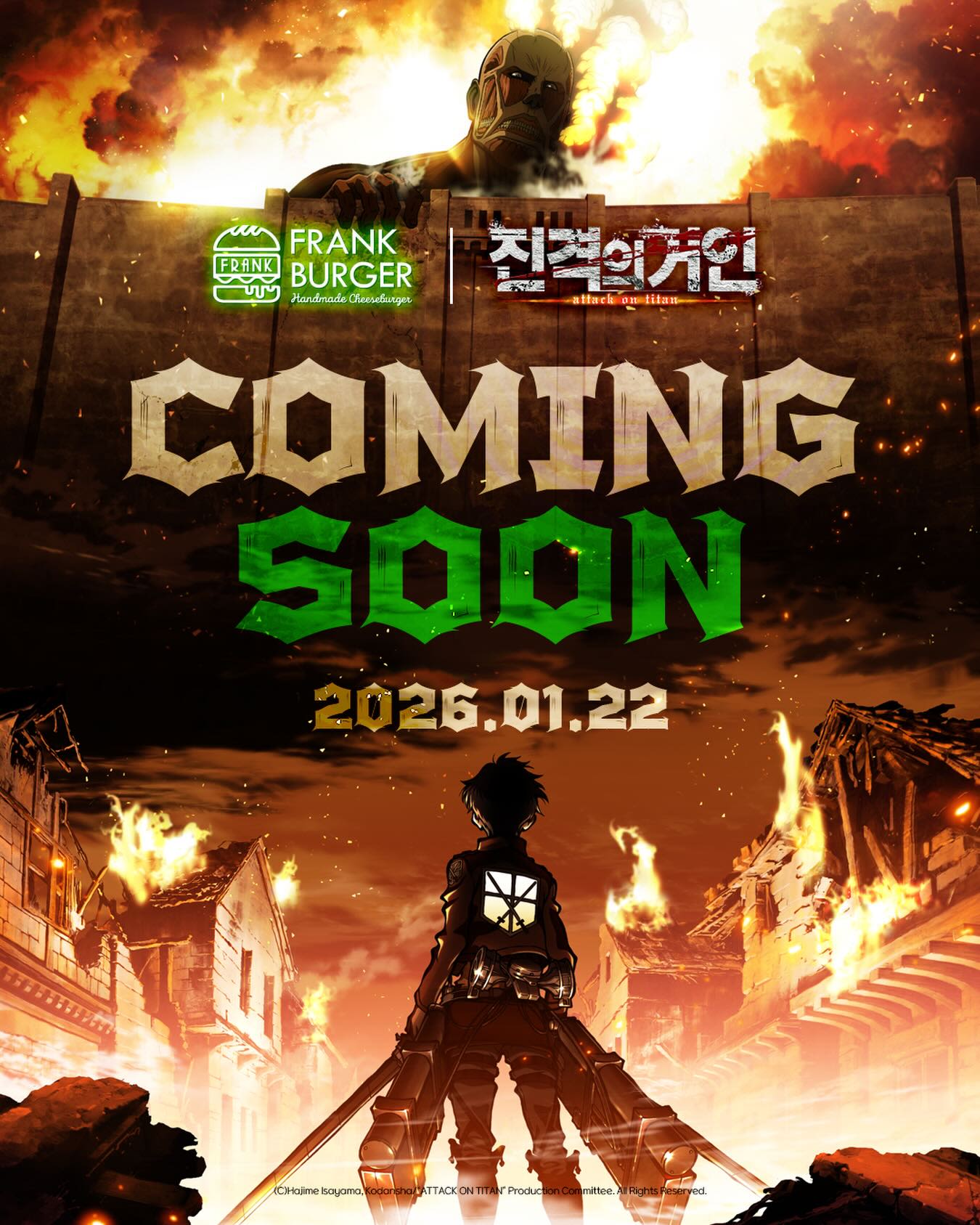 There's collaboration news heating up on social media even before its official release. It's the meeting of the anime Attack on Titan and Frank Burger! Collaboration products will be released, including goods faithfully recreating the Survey Corps blanket from the anime, and a burger set that comes with a random acrylic keychain featuring character motifs. They say if you order through the official Frank Burger app, you'll even get a chance for additional prizes! It might sell out if you hesitate, so shall we move quickly? š Frank Burger franchises šļø Jan 22 (Thu), 2026 OPEN
